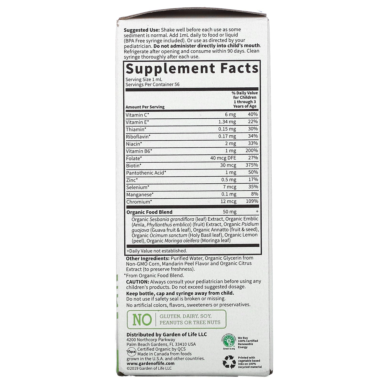 Tamaño de la porción: 1 ml Porción por envase: 56 Cantidad por porción %Valor diario para niños de 1 a 3 años de edad Vitamina C* 6 mg 40 % Vitamina E* 1,34 mg 22 % Tiamina* 0,15 mg 30 % Riboflavina* 0,17 mg 34 % Niacina* 2 mg 33 % Vitamina B6* 1 mg 200 % Folato* 40 mcg DFE 27 % Biotina* 30 mcg 375 % Ácido pantoténico* 1 mg 50 % Zinc* 0,5 mg 17 % Selenio* 7 mcg 35 % Manganeso* 0,1 mg 8 % de cromo* 12 mcg 109 % mezcla de alimentos orgánicos Extracto orgánico de Sesbania grandiflora (hoja), extracto orgánico de Emblic (Amla, Phyllanthus emblica) (fruta), Psidium guajava orgánico (fruto y hoja de guayaba), achiote orgánico (fruta y semilla), orgánico Ocimum sanctum (hoja de Albahaca Sagrada), Limón Orgánico (cáscara), Moringa oleifera Orgánica (hoja de la mañana) 50 mg + +Valor Diario no establecido. Descargo de responsabilidad